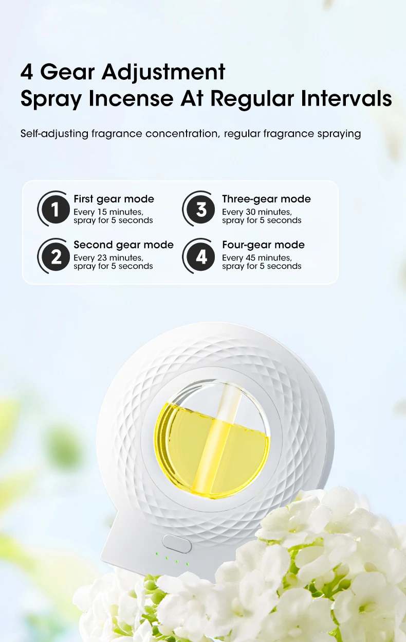 4.Wide application: The Aroma Diffuser Desktop Wall-Mounted Automatic Incense Sprayer is suitable for various spaces, including home, bedroom, toilet, office, and more, creating a refreshing and inviting atmosphere wherever it is placed.